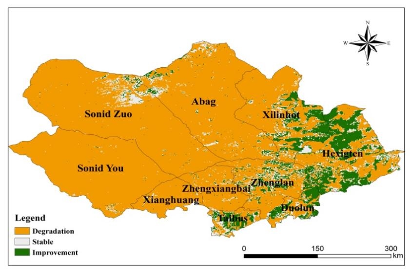 隨著國(guó)家生態(tài)恢復(fù)工程的啟動(dòng),渾善達(dá)克沙地未出現(xiàn)新的生態(tài)質(zhì)量退化區(qū)域,目前生態(tài)系統(tǒng)質(zhì)量提高區(qū)域占沙地五分之一,主要分布在東部。