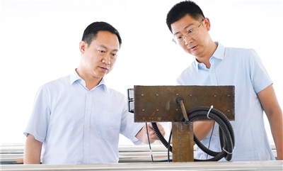 于志永(左)調研水質提升改造項目,查看儀器運行。 (圖片由海南區(qū)融媒體中心提供)