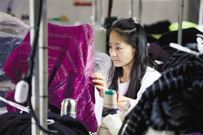 章嘉廟村一羊絨制品廠(chǎng)的工人正在趕制訂單。本報(bào)記者馬駿馳攝