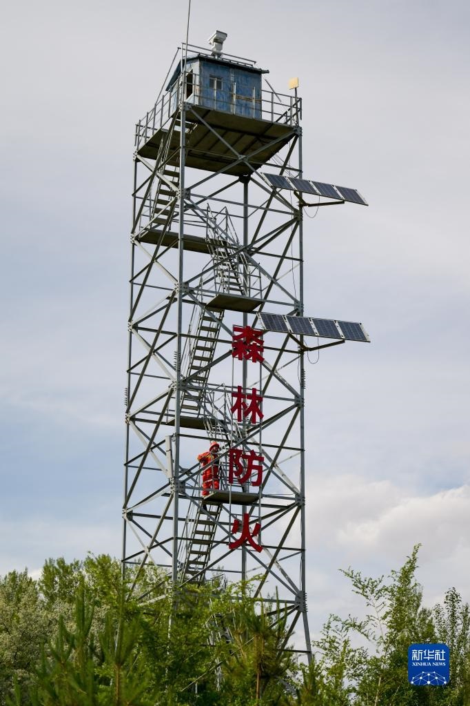 6月5日,臨河區(qū)國營新華林場護(hù)林員登上瞭望塔準(zhǔn)備開展巡護(hù)工作。新華社記者 李志鵬 攝