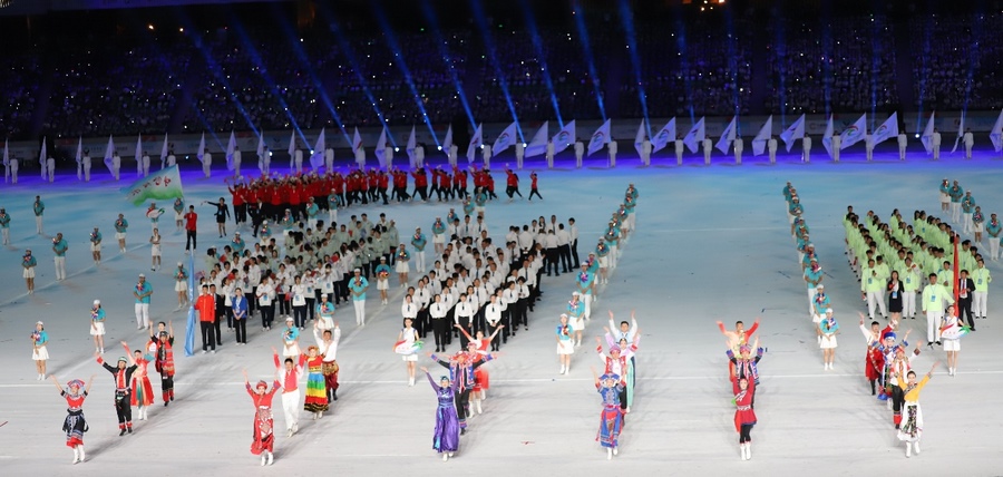 入場(chǎng)儀式結(jié)束后,在雄壯的國歌聲中,鮮艷的五星紅旗冉冉升起,在體育中心上空迎風(fēng)飄揚(yáng)。期盼的眼神,真摯的祝福,蕩漾在每個(gè)人的心間。開幕式文體展演隨后正式拉開帷幕。