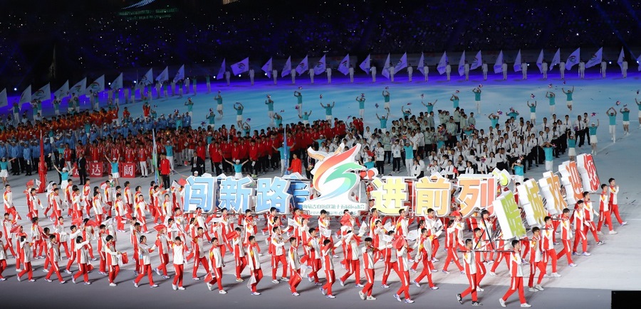 開幕式現(xiàn)場(chǎng)座無虛席,萬眾矚目下儀仗隊(duì)護(hù)送五星紅旗步入會(huì)場(chǎng),國旗莊嚴(yán),腳步鏗鏘,一種豪邁和驕傲激蕩在每個(gè)人的心里。