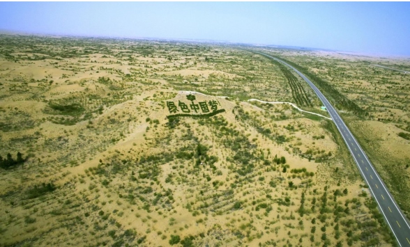 億利庫布其沙峰綠谷生態(tài)區(qū),由5600棵沙地柏種下的“綠色中國夢”五個大字耀眼醒目。