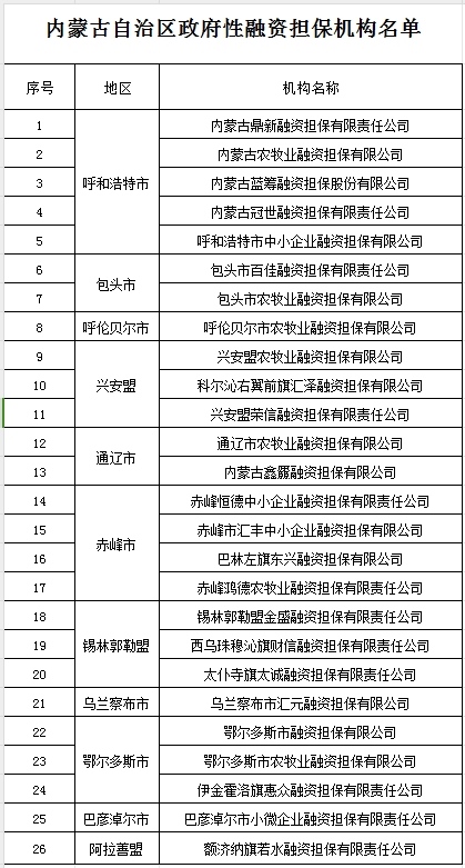 關于公布內蒙古自治區(qū)政府性融資擔保機構名單的通知