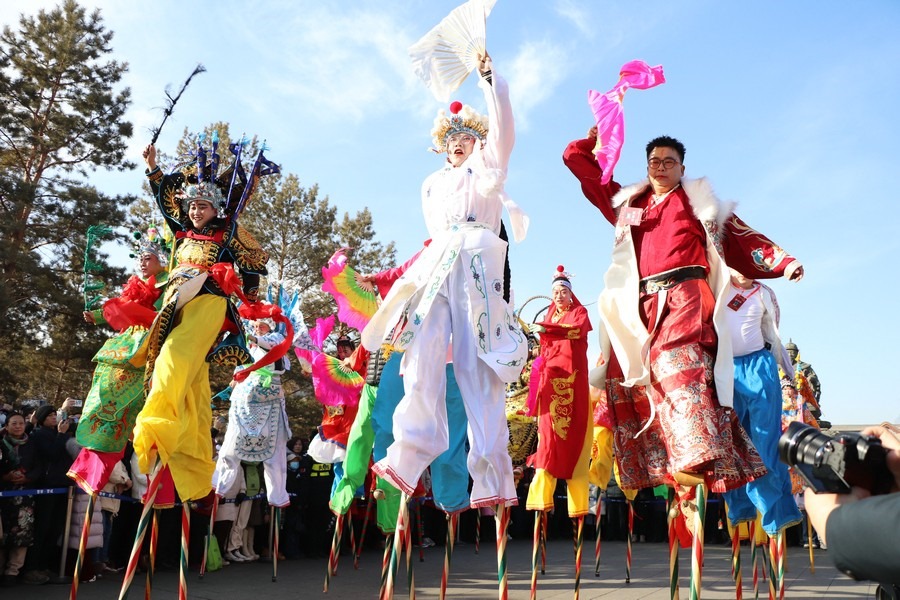 現(xiàn)場(chǎng)人潮涌動(dòng),歡聲笑語此起彼伏。扭秧歌隊(duì)伍身著色彩斑斕的服裝,手持彩扇,隨著歡快的音樂節(jié)奏,邁出輕盈的步伐,每一個(gè)動(dòng)作都充滿了力量感和韻律感。他們的表情歡快,笑容燦爛,將歡樂傳遞給每一位觀眾。與此同時(shí),踩高蹺也吸引了眾多觀眾的目光。演員們踩著高高的木蹺,身著華麗的戲服,扮演著各種角色,自如地行走、跳躍,引得觀眾陣陣喝彩。