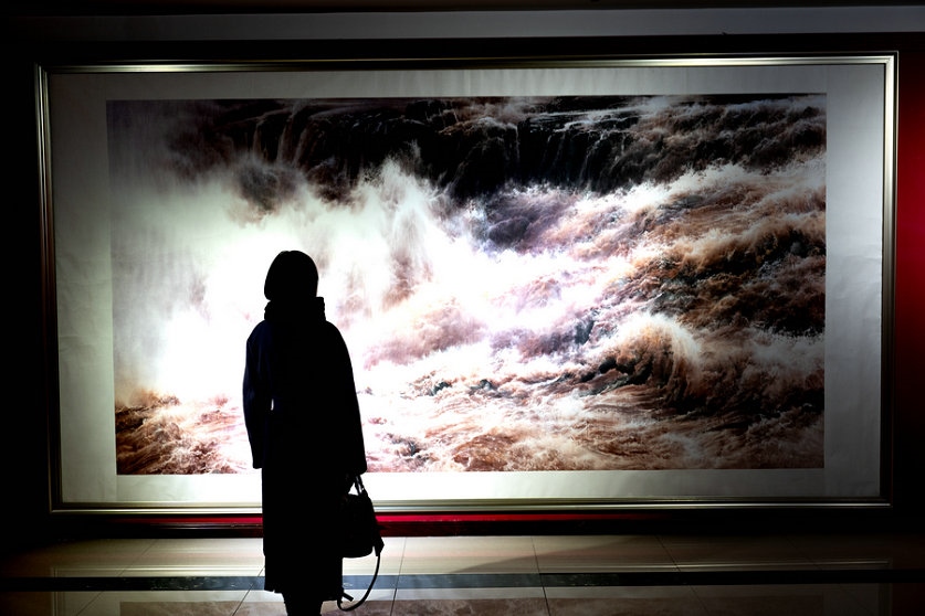 在展覽館的正中央,一幅氣勢(shì)如虹的黃河作品格外耀眼,吸引著觀展者的駐足欣賞。
