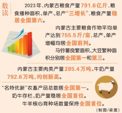 五谷者,萬(wàn)民之命,國(guó)之重寶。2023年,內(nèi)蒙古以糧食產(chǎn)量791.6億斤迎來(lái)了第二十個(gè)豐收年。糧食播種面積、單產(chǎn)、總產(chǎn)“三增長(zhǎng)”,糧食產(chǎn)量穩(wěn)居全國(guó)第六。全區(qū)主要肉類產(chǎn)量285.4萬(wàn)噸、牛奶產(chǎn)量792.6萬(wàn)噸,均創(chuàng)新高?!懊貎?yōu)新”農(nóng)畜產(chǎn)品總數(shù)居全國(guó)第一,“內(nèi)蒙古味道”香飄萬(wàn)里。