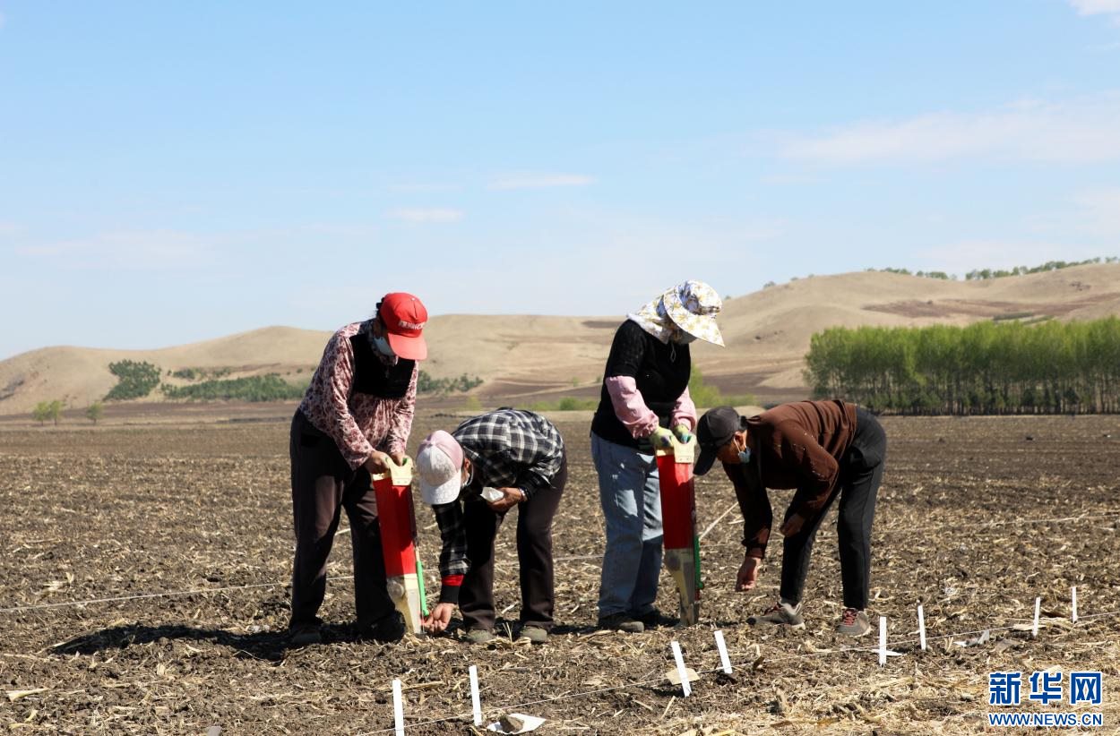 ?5月7日,在內(nèi)蒙古扎蘭屯大豆科技小院,農(nóng)民在大河灣鎮(zhèn)尖山子村試驗(yàn)田手工播種大豆。新華網(wǎng)發(fā) (韓冷 攝)