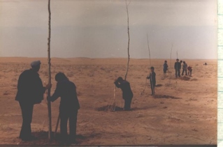 ??“領(lǐng)導(dǎo)都帶頭干,王占文書記包的我們奮勇大隊(duì),帶我們種沙柳。全大隊(duì)11個生產(chǎn)隊(duì),排著隊(duì)、唱著歌,把紅旗插在各自的沙梁上。民兵也領(lǐng)著娃娃們來種樹,他們掏坑,娃娃遞樹栽子。幾年下來,把奮勇大隊(duì)種成了自治區(qū)最早的萬畝林大隊(duì)。馮耀華當(dāng)時是公社副書記,包的是阿魯柴登,郭巨才當(dāng)時是公社副主任,包了什里加汗。王占文還專門組織了測繪隊(duì),繪出地圖,統(tǒng)一規(guī)劃,給所有農(nóng)田種上防護(hù)林,定下在哪修路種上行道樹。20年后按圖修路時,施工隊(duì)發(fā)現(xiàn),路基兩旁的樹早種好了。”白三寶回憶。