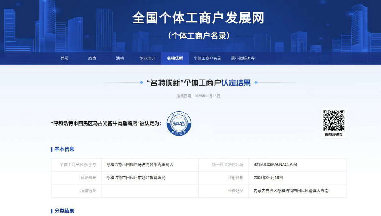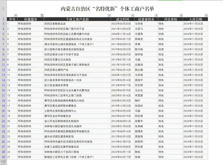 去年,呼和浩特市市場監(jiān)管局等16個市級部門聯(lián)合制定實施《呼和浩特市個體工商戶分型分類實施方案(試行)》,開展“名特優(yōu)新”個體工商戶申報和推薦工作。通過線上線下雙渠道,利用個體工商戶服務(wù)月活動,向廣大個體工商戶普及申報政策和流程,鼓勵符合條件的個體工商戶參與申報。通過材料審核、走訪核實、征求意見、評審認定、信息公示等程序,經(jīng)區(qū)縣、市、自治區(qū)逐級復核上報,呼和浩特市首批認定全國“名特優(yōu)新”的27戶個體工商戶已完成入庫(其中“知名”15戶、“特色”10戶、“優(yōu)質(zhì)”2戶),被認定的個體工商戶可享受由國家、自治區(qū)、市出臺的相關(guān)扶持培育政策。