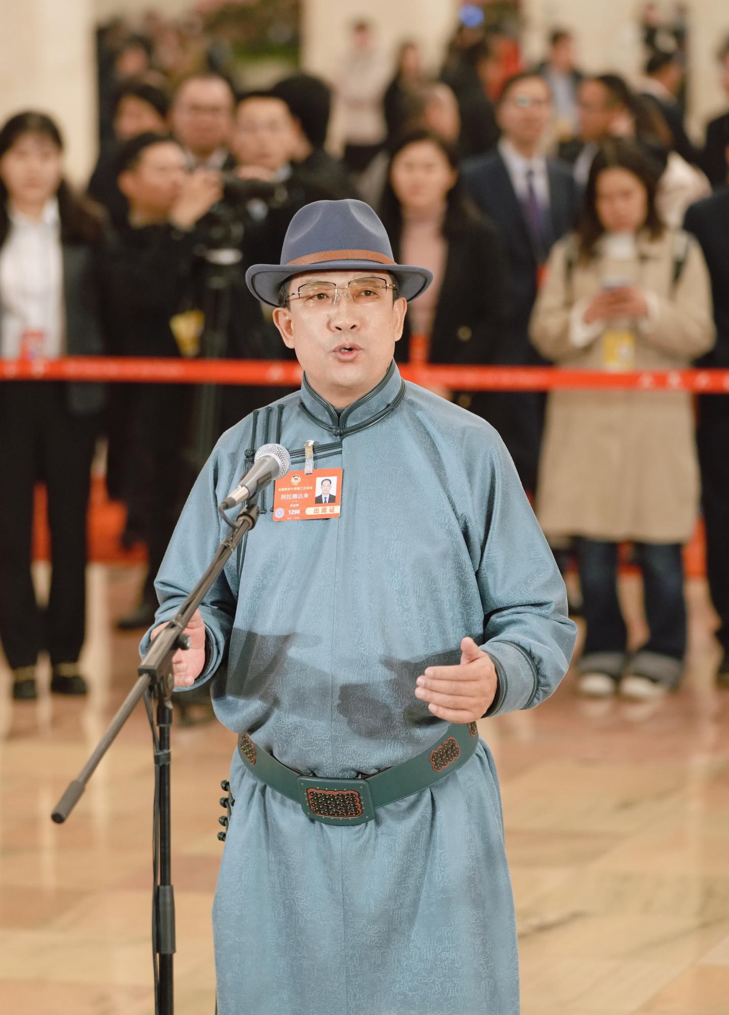 “大家好,我是全國政協(xié)委員、內(nèi)蒙古自治區(qū)錫林郭勒盟蘇尼特左旗烏蘭牧騎隊長阿拉騰達(dá)來?!?時15分許,住內(nèi)蒙古全國政協(xié)委員阿拉騰達(dá)來身著蒙古族服飾,走上“委員通道”,從容自信地向在場媒體記者作自我介紹。