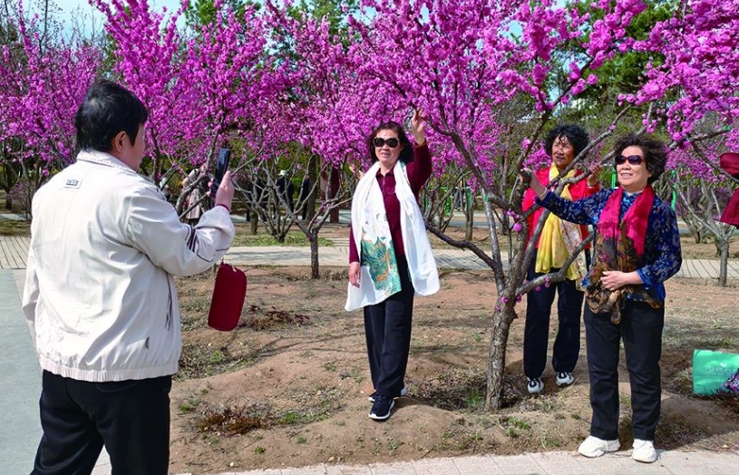 走進(jìn)植物園,道路兩側(cè)的榆葉梅競(jìng)相綻放,粉紅色的花朵層層疊疊掛滿枝頭,形成一片爛漫花海。從浙江來(lái)的游客李筱正用手機(jī)記錄美景:“原本擔(dān)心錯(cuò)過北方花期,沒想到這里的榆葉梅開得這么漂亮,完全不輸江南的春天?!?/p>