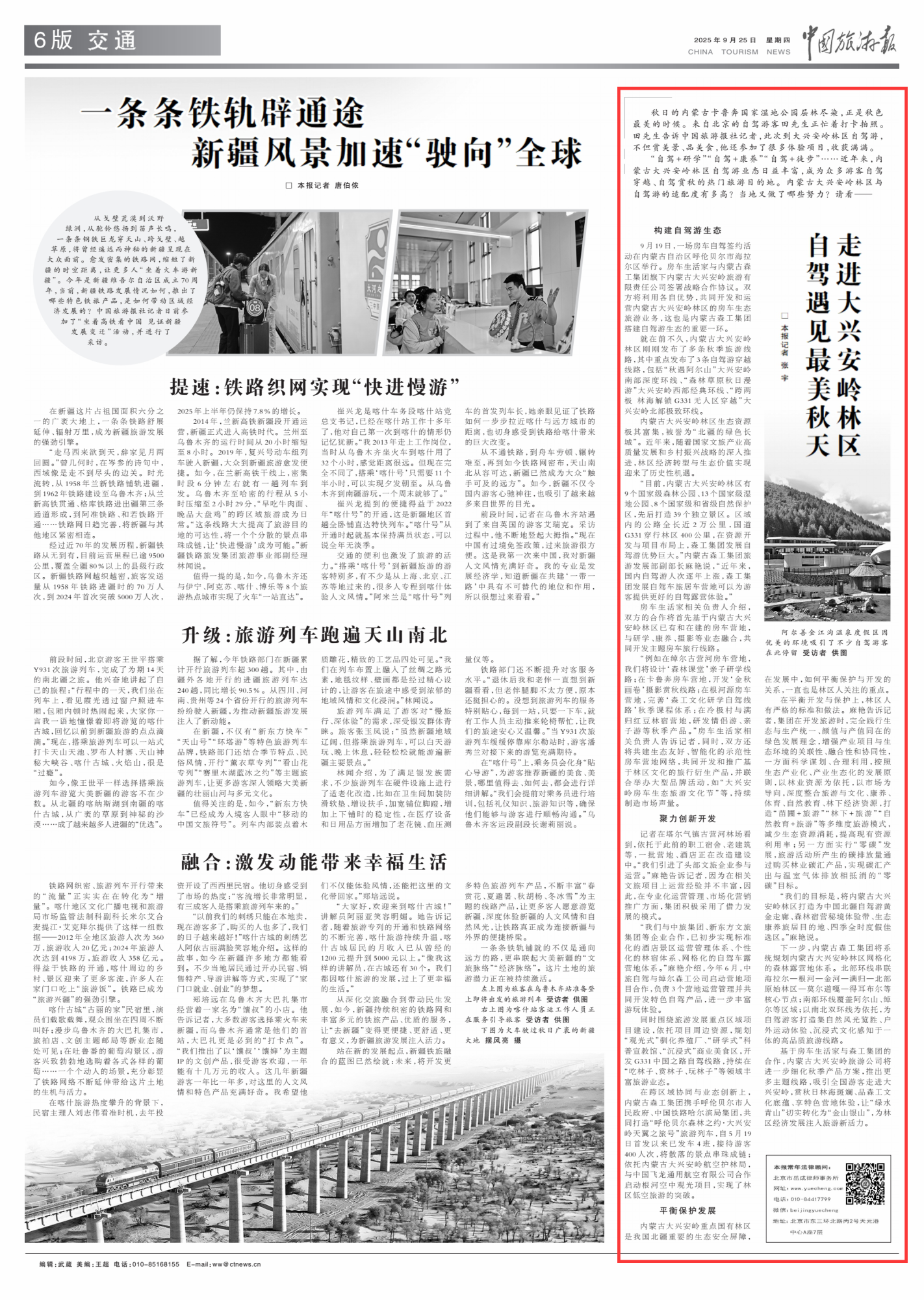 2025年9月25日,《中國旅游報(bào)》第6版刊發(fā)題為《走進(jìn)大興安嶺林區(qū) 自駕遇見最美秋天》的文章,報(bào)道了“自駕+研學(xué)”“自駕+康養(yǎng)”“自駕+徒步”……內(nèi)蒙古大興安嶺林區(qū)自駕游業(yè)態(tài)日益豐富,成為眾多游客自駕穿越、自駕賞秋的熱門旅游目的地。