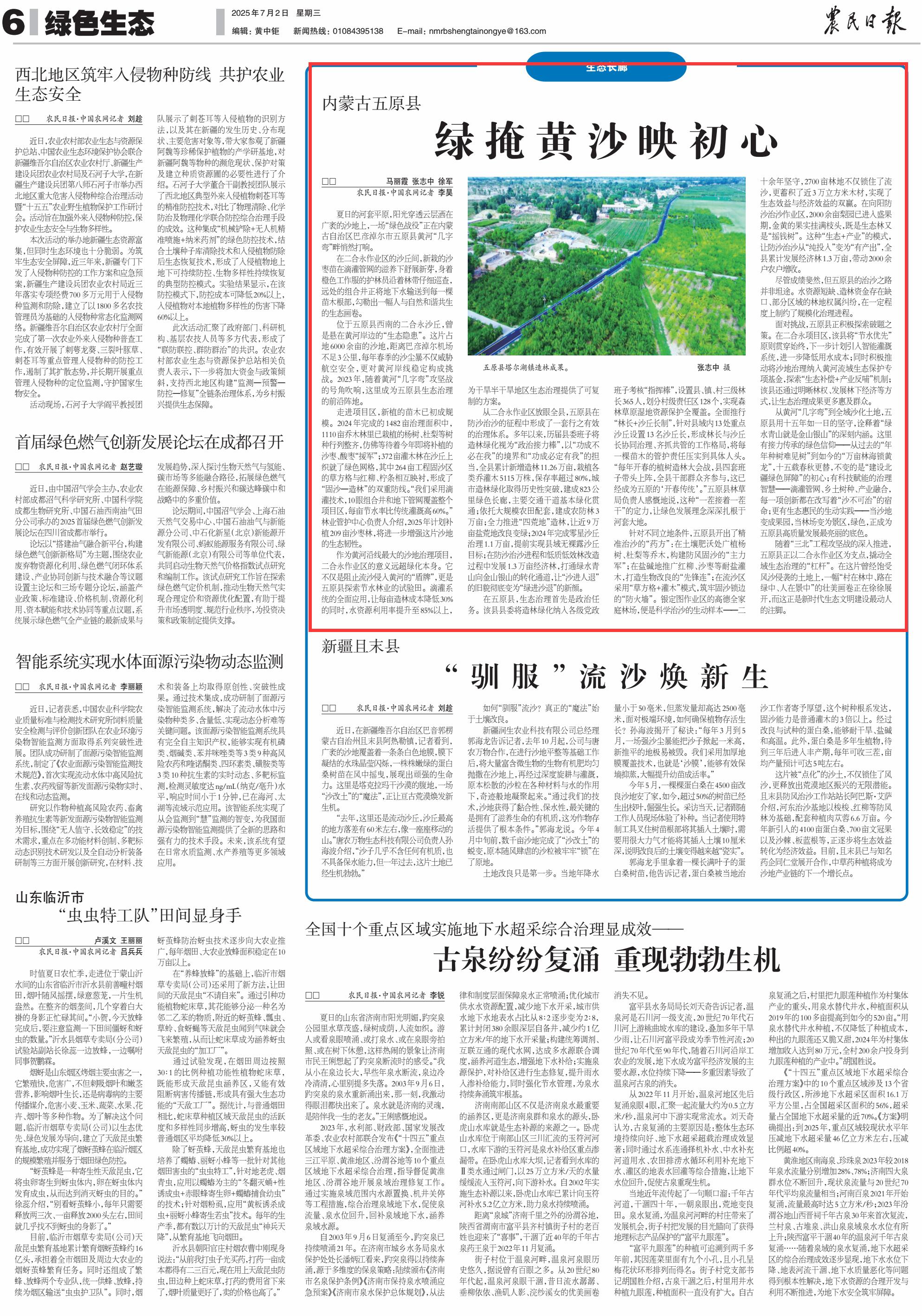 2025年7月2日《農民日報》第6版刊發(fā)了《內蒙古五原縣綠掩黃沙映初心》的文章,報道了從黃河“幾字彎”到全域沙化土地,內蒙古自治區(qū)巴彥淖爾市五原縣用十五年如一日的堅守,詮釋著“綠水青山就是金山銀山”的深刻內涵。當沙地變成果園,當林場變?yōu)榫皡^(qū),綠色,正成為五原縣高質量發(fā)展最亮麗的底色。