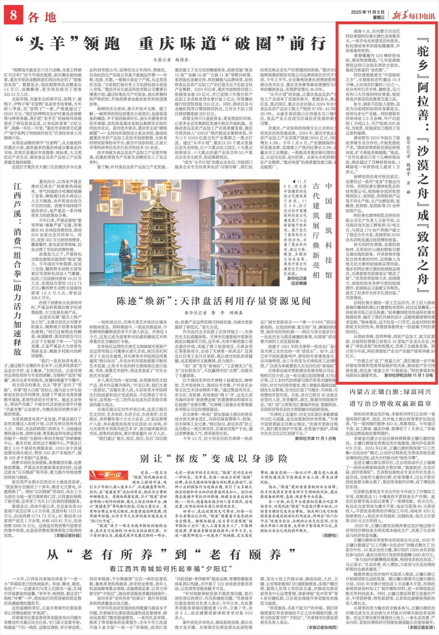 2025年11月5日,《新華每日電訊》第8版刊發(fā)題為《“駝鄉(xiāng)”阿拉善:“沙漠之舟”成“致富之舟”》的文章,報(bào)道了阿拉善盟被譽(yù)為“中國駱駝之鄉(xiāng)”,駱駝存欄量達(dá)16.8萬峰,占全國存欄量的三分之一。預(yù)計(jì)到今年底,阿拉善盟駝產(chǎn)業(yè)全產(chǎn)業(yè)鏈產(chǎn)值將突破30億元。