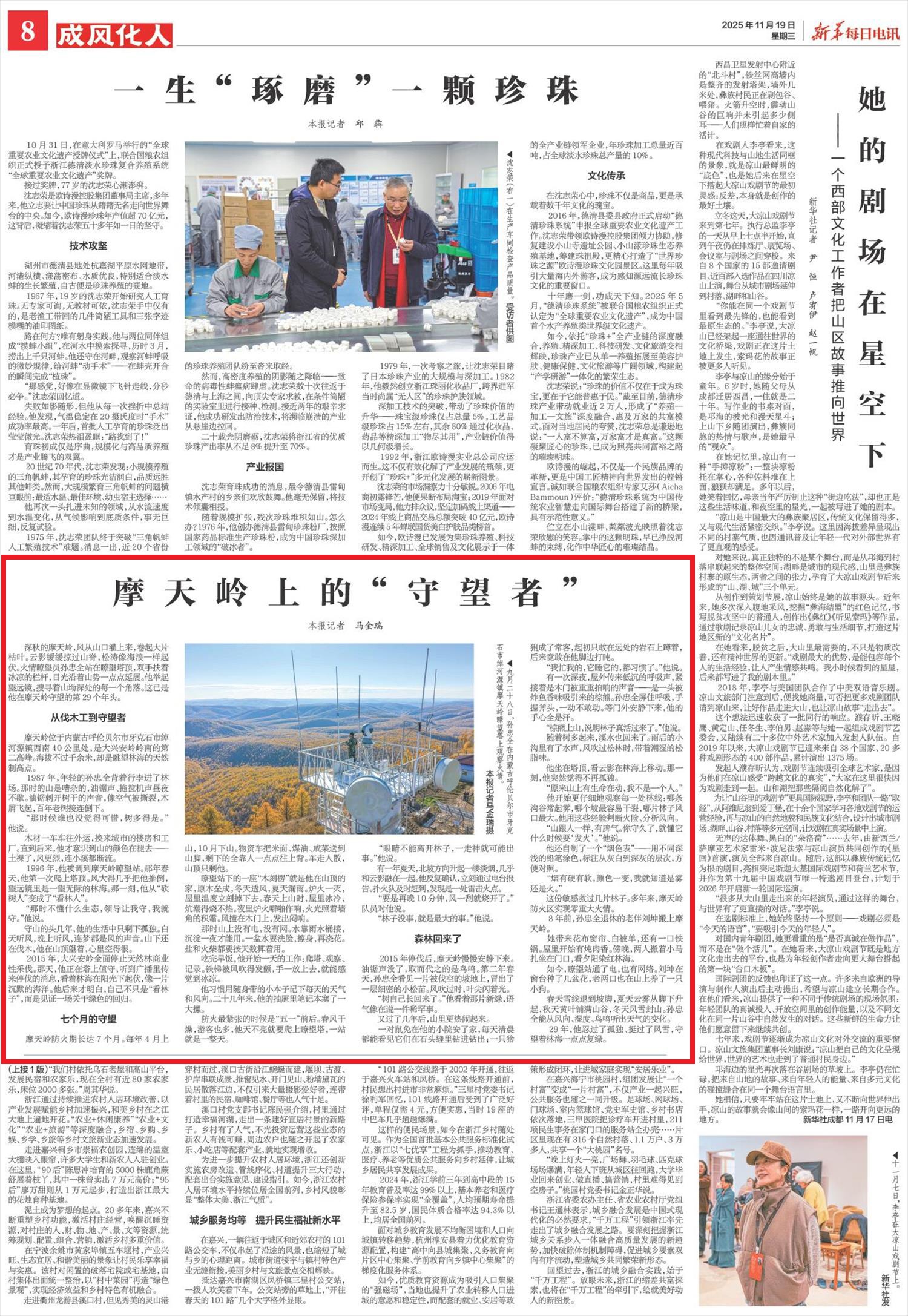 2025年11月19日,《新華每日電訊》第8版刊發(fā)題為《摩天嶺上的“守望者”》的文章,報道了摩天嶺位于內(nèi)蒙古呼倫貝爾市牙克石市綽河源鎮(zhèn)西南40公里處,是大興安嶺嶺南的第二高峰。火情瞭望員孫忠全站在瞭望塔頂,雙手扶著冰涼的欄桿,目光沿著山勢一點(diǎn)點(diǎn)延展。他舉起望遠(yuǎn)鏡,搜尋著山坳深處的每一個角落。這已是他在摩天嶺守望的第29個年頭。