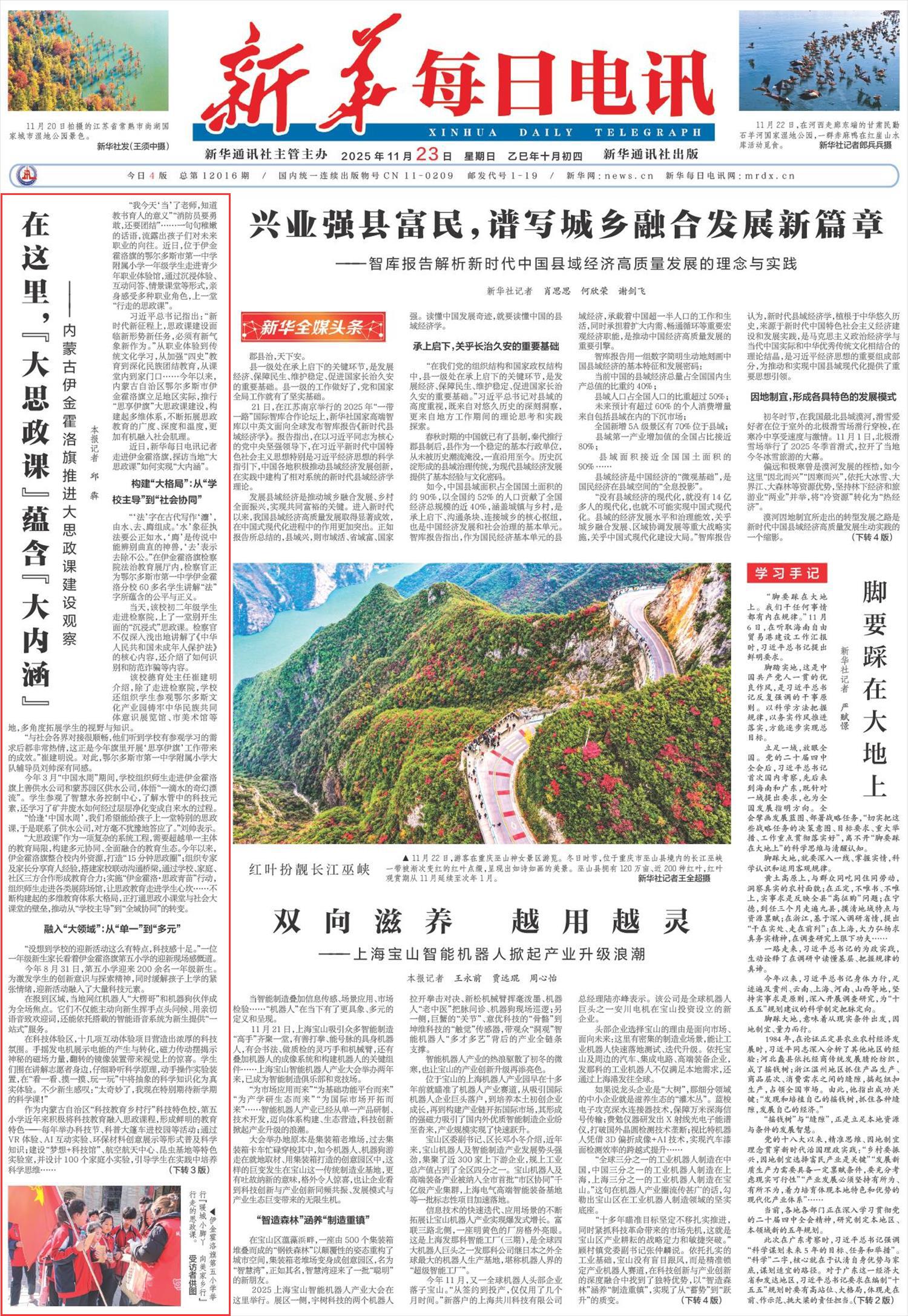 2025年11月23日,《新華每日電訊》頭版刊發(fā)題為《在這里,“大思政課”蘊含“大內(nèi)涵”——內(nèi)蒙古伊金霍洛旗推進大思政課建設(shè)觀察》的文章,報道了內(nèi)蒙古自治區(qū)鄂爾多斯市伊金霍洛旗立足地區(qū)實際,推行“思享伊旗”大思政課建設(shè),構(gòu)建起多維體系,不斷拓展思政教育的廣度、深度和溫度,更加有機融入社會肌理。