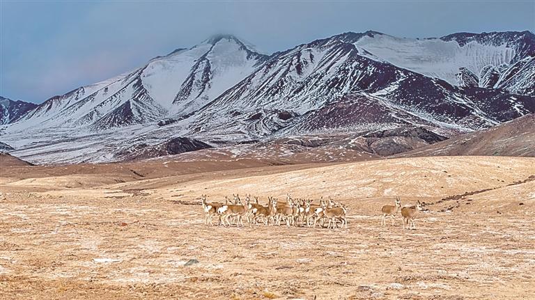 冬日,國家二級保護野生動物藏原羚在甘肅省阿克塞縣阿勒騰鄉(xiāng)哈爾騰草原活動覓食。新華社發(fā)