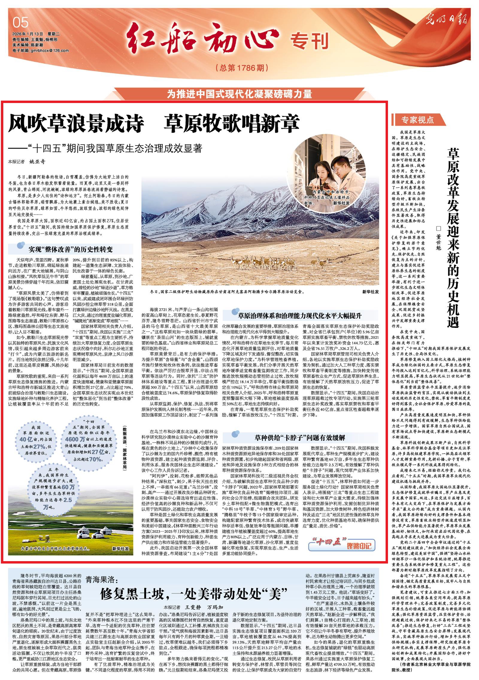 2026年1月13日,《光明日報》5版刊發(fā)題為《風吹草浪景成詩 草原牧歌唱新章——“十四五”期間我國草原生態(tài)治理成效顯著》的文章,報道了“十四五”期間,我國持續(xù)加強草原保護修復,草原生態(tài)質量持續(xù)改善,交出一張綠意充盈的草原治理成績單。