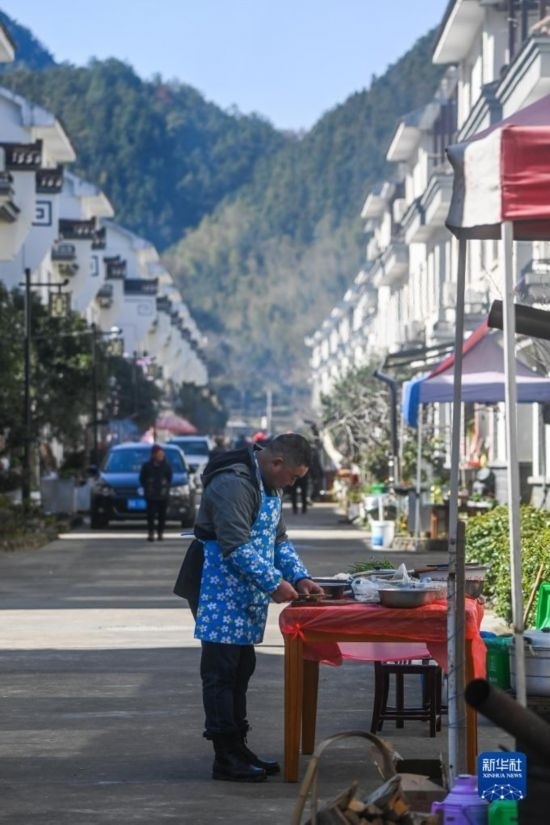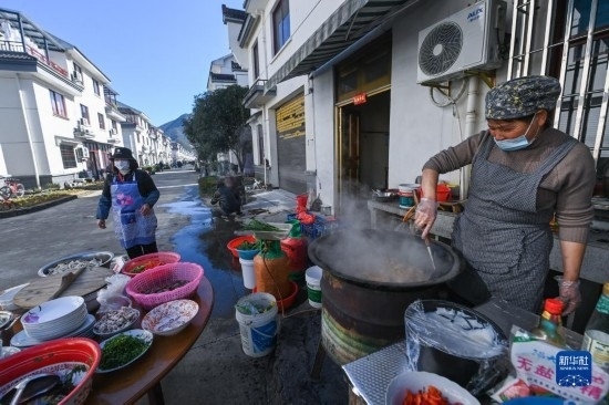 2月26日,蓮花鎮(zhèn)戴家新村的村民在新居門(mén)前烹飪農(nóng)家菜,為百家宴做準(zhǔn)備。