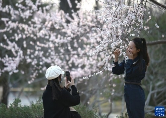 3月8日,游客在北京玉淵潭公園賞花留影。