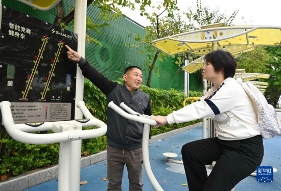 4月24日,西河智慧體育公園工作人員(左)向晨練的市民介紹具備對運(yùn)動數(shù)據(jù)進(jìn)行采集、分析等多項(xiàng)功能的智能競賽健身車。