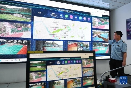 4月24日,西河智慧體育公園工作人員在介紹智慧體育綜合管控平臺。該平臺可對公園內(nèi)的人流、安全、環(huán)境以及公園周邊“15分鐘健身圈”運(yùn)動場地的門禁、燈光等設(shè)備實(shí)現(xiàn)智能化管理。