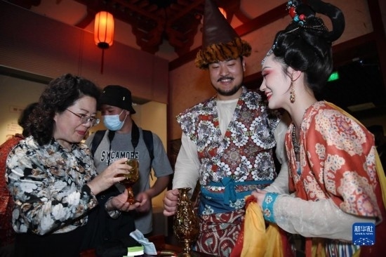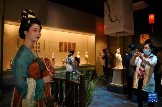 5月22日晚,在西安博物院《長(zhǎng)安有故里——絲路少年大唐行》展覽上,身著復(fù)原唐裝的演員與游客互動(dòng)。