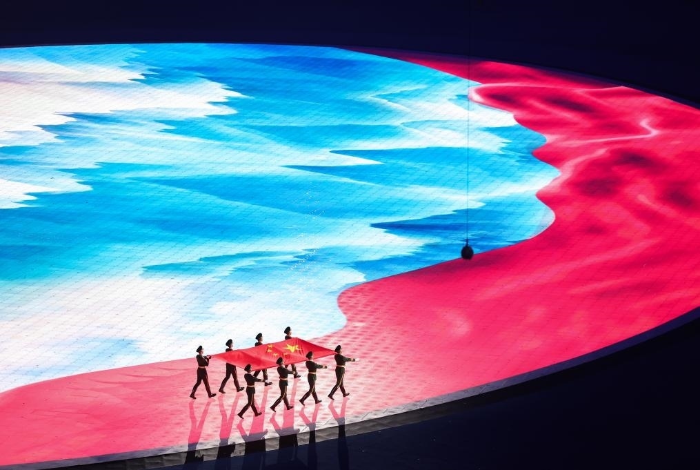 地屏上,一幅紅綢飛掠壯麗河山。8名儀仗兵步伐鏗鏘,護(hù)旗入場(chǎng)?!拔覑勰阒袊?guó),我愛你春天蓬勃的秧苗……”動(dòng)人的贊歌深情唱響。