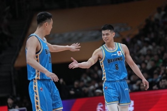 4月18日,CBA季后賽,北京首鋼隊(duì)球員方碩(右)與隊(duì)友翟曉川擊掌。新華社記者潘昱龍攝