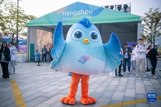 10月16日,杭州亞殘運(yùn)會(huì)吉祥物“飛飛”在開(kāi)村儀式上。新華社記者 江漢 攝
