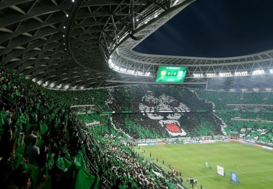 8月19日,球迷在現(xiàn)場擺出北京國安隊的雄獅圖案。新華社記者 張晨霖 攝