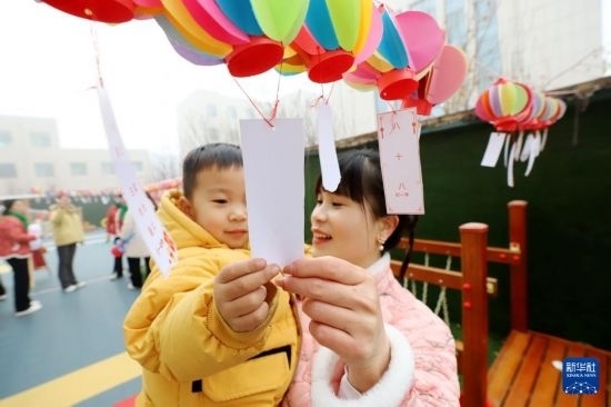 12月30日,在山東省濱州市惠民縣一所幼兒園,小朋友和家長一起猜燈謎。