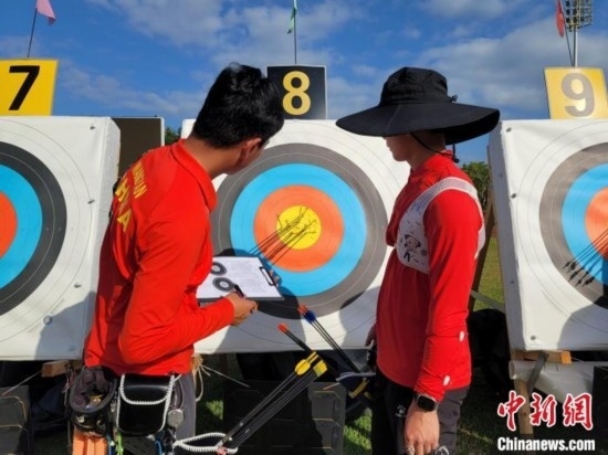 國家體育訓(xùn)練南方基地(海南白沙·綜合),一輪射箭之后,運(yùn)動員在查看中靶情況。中新網(wǎng)記者王曉斌攝