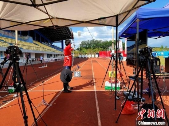國家體育訓(xùn)練南方基地(海南白沙·綜合),國家射箭隊紅隊在進(jìn)行一場隊內(nèi)賽。 中新網(wǎng)記者 王曉斌 攝