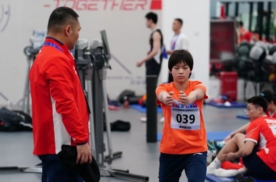 2023年12月29日,2023年國家隊冬訓(xùn)體能大比武在國家體育總局訓(xùn)練局舉行,來自射擊、舉重、田徑、游泳、跳水、花樣游泳、體操、蹦床、乒乓球、羽毛球等10支國家隊的150名運動員參加活動。圖為國家跳水隊運動員全紅嬋在測試前熱身。