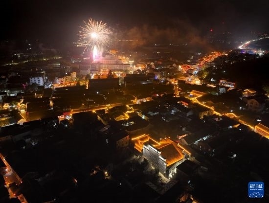 2月23日晚,古鎮(zhèn)舉行放銃花活動(無人機(jī)照片)。