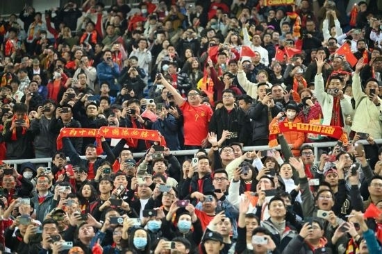 據(jù)主辦方介紹,天津奧體中心體育場(chǎng)的球票基本銷售一空,有42977名觀眾到場(chǎng)為中國隊(duì)助威。比賽在晚上8點(diǎn)開球,結(jié)束已是10點(diǎn)左右。初春夜晚加之冷風(fēng),寒意十足,但球迷的熱情和助威貫穿全程。