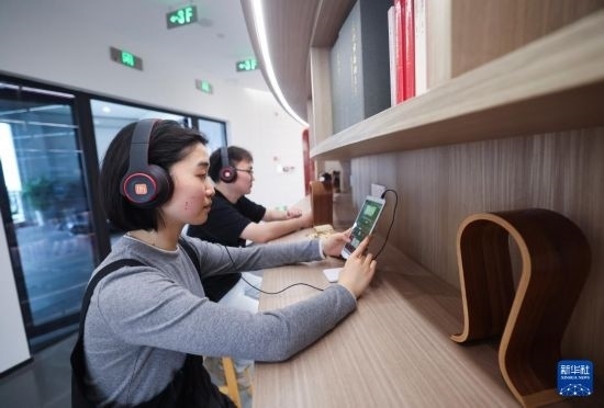 4月16日,在嘉興市南湖區(qū)新時(shí)代文明實(shí)踐中心,讀者依托數(shù)字化設(shè)備聽“有聲讀物”。