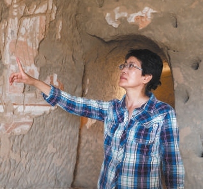 克孜爾石窟內(nèi),趙莉(見圖)對著壁面上的切割痕跡,與電腦里的數(shù)百張照片來回比對,題材內(nèi)容、顏色、紋飾圖案,都要一一對應(yīng)。突然,腦海中一張照片精準鑲嵌進了缺失的那塊壁面——這樣的“靈感突現(xiàn)”,源于她對每個洞窟每幅壁畫以及被揭取痕跡的熟悉程度。在克孜爾石窟群穿梭了32年,作為克孜爾石窟研究院研究館員,每一個洞窟都深深刻印在了她的腦海中。
