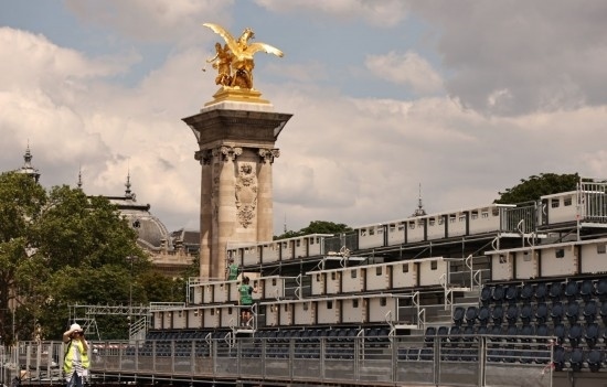 這是6月4日在位于法國巴黎市中心的亞歷山大三世橋拍攝的臨時(shí)比賽場地搭建現(xiàn)場。新華社記者 高靜 攝