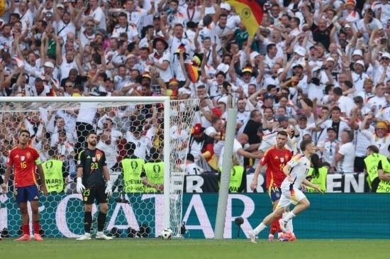 久攻之下,德國隊(duì)終于在第89分鐘扳平比分,米特爾施泰特左路傳中,基米希頭球回?cái)[,維爾茨抽射入網(wǎng)。兩隊(duì)在常規(guī)時(shí)間1:1戰(zhàn)平,比賽進(jìn)入加時(shí)賽。第106分鐘,德國隊(duì)穆夏拉射門擊中西班牙隊(duì)庫庫雷利亞手臂,后者當(dāng)時(shí)在本方禁區(qū)內(nèi)防守,但主裁判并沒有判罰點(diǎn)球,VAR(視頻助理裁判)也沒有介入。