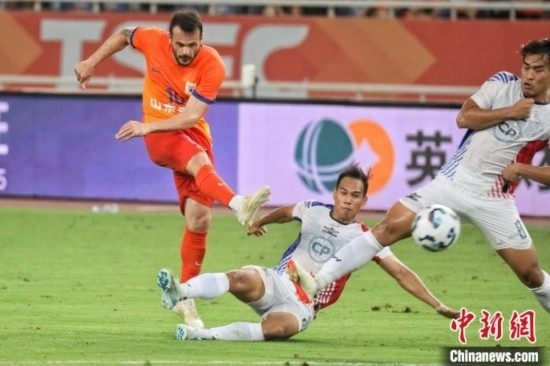 山東泰山隊卡扎伊什維利(左一)在比賽中射門。中新社發(fā) 陳陽 攝