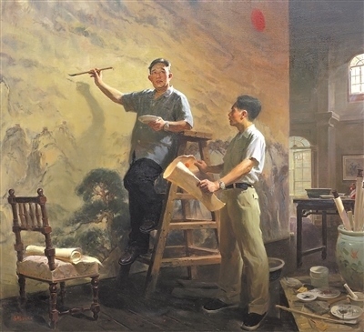 正在舉辦的第十四屆全國美術(shù)作品展覽進(jìn)京作品展上,撲面而來的藝術(shù)形象是腳踏中華大地的各族人民,是中國近現(xiàn)代文化史上的先賢圣哲,是和我們一道相擁而立的堂堂中國人。這些形象剛強(qiáng)勇毅,如潮如云,傳遞著眾志成城的精神力量,扣動(dòng)人心。譬如,呂鵬《山河頌》,以濃郁的色調(diào),再現(xiàn)傅抱石、關(guān)山月兩位前輩創(chuàng)作《江山如此多嬌》的情景,鐫刻新中國美術(shù)史上重要一幕;鄔大勇《我心中的英雄》塑造了畫家少年時(shí)代的英雄偶像——錢學(xué)森等一代科學(xué)家。還有許多氣勢(shì)宏大的創(chuàng)作,它們既是社會(huì)生活、時(shí)代精神的藝術(shù)載體,又是美術(shù)工作者面對(duì)歷史、面對(duì)人民的激情熔爐。這些作品以人民形象為根基,深植時(shí)代沃土,構(gòu)成歷史與現(xiàn)實(shí)相輝映的史詩畫卷。