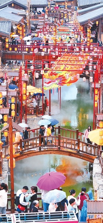 龍門浩老街上,幾名外地游客沿著青石臺(tái)階漫步至老街最高點(diǎn)——攬?jiān)屡_(tái),遠(yuǎn)眺渝中半島。這條位于重慶市南岸區(qū)南濱路中段的老街,面朝長(zhǎng)江,背依南山,開埠文化、巴渝文化等文化底蘊(yùn)深厚。近年來,經(jīng)過保護(hù)與修繕,這里不僅恢復(fù)了歷史風(fēng)貌,還增添了現(xiàn)代時(shí)尚氣息。古色古香的街道兩旁,新潮的商鋪、餐館和咖啡館為市民游客休閑購物提供便利和全新體驗(yàn)。“感受時(shí)光交錯(cuò)的美妙”,成為這里的一大魅力。數(shù)據(jù)顯示,自發(fā)展全域旅游以來,龍門浩老街所在的龍門浩街道已接待游客近4000萬人次,實(shí)現(xiàn)旅游收入276.8億元,龍門浩老街還成功創(chuàng)建第二批國(guó)家級(jí)夜間文旅消費(fèi)聚集區(qū)。