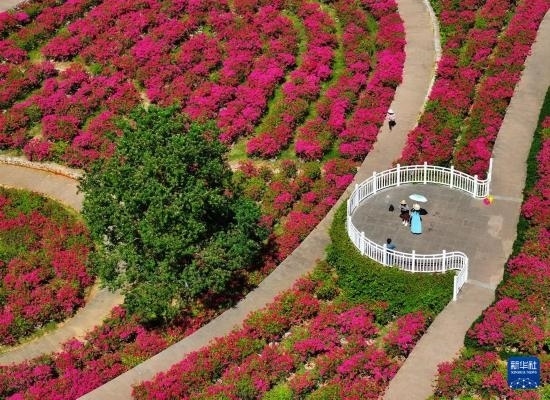 游人在南寧青秀山風(fēng)景區(qū)葉子花園觀賞三角梅(10月25日攝,無人機照片)。