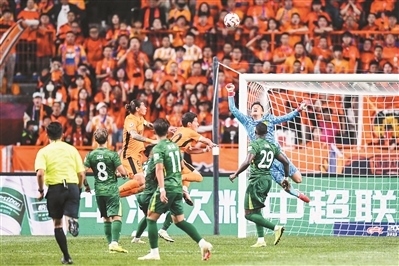 北京國安隊(duì)門將韓佳奇(上右)在比賽中撲救。
