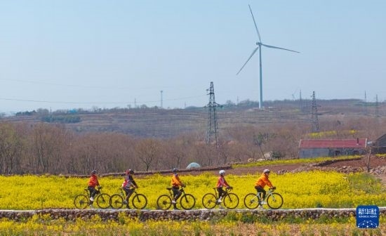 3月20日,騎行者在安徽省滁州市來(lái)安縣張山鎮(zhèn)的油菜田中拍照打卡。