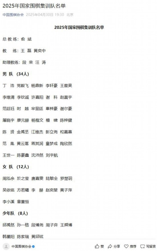 據國家圍棋集訓隊選拔小組負責人介紹,根據《國家圍棋集訓隊運動員入隊標準》,報中國圍棋協(xié)會批準,共有54人入選2025屆國家集訓隊。男隊由王星昊、丁浩、黨毅飛、楊鼎新、李軒豪、李維清、李欽誠等34名棋手組成;女隊有12人,包括周泓余、於之瑩、唐嘉雯等。此外,國少隊還有8名棋手。國家圍棋集訓隊的教練組由5人組成,俞斌擔任總教練,王磊、黃奕中擔任教練,段榮和汪濤任助理教練。