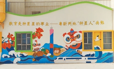 清晨,太陽剛剛升起,新疆伽師縣西克爾庫勒鎮(zhèn)中心幼兒園內(nèi),一群背著畫板、提著顏料箱的年輕人已開始忙碌。剛翻新的幼兒園墻面成為他們的畫布,大海與雪山、醒獅與烤馕、廣州塔與喀什高臺民居等粵新兩地文化元素在此相遇。百人共繪的畫卷(局部見圖),不僅點亮邊疆孩子們的藝術(shù)星空,也滋潤著共創(chuàng)者的心靈。
